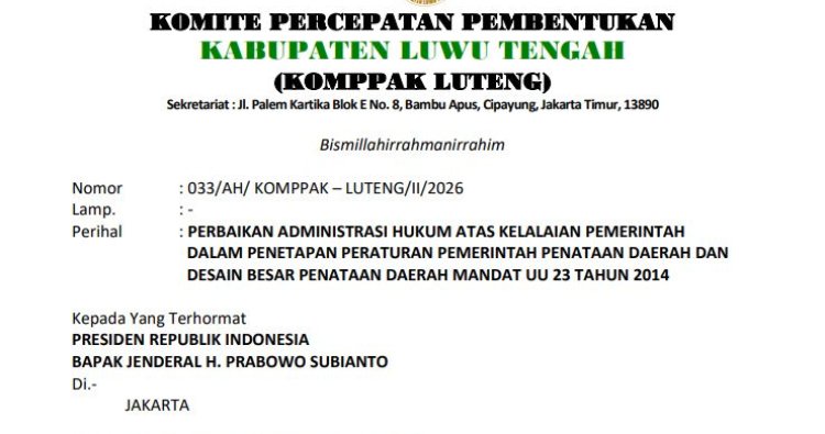 JAKARTA - Komite Percepatan Pembentukan Kabupaten Luwu Tengah (KOMPPAK Luteng) menilai ketiadaan Peraturan Pemerintah (PP) tentang Penataan Daerah dan Desain Besar Penataan Daerah telah menimbulkan kerugian nyata bagi masyarakat. Atas dasar itu, KOMPPAK Luteng secara resmi menyurati Presiden Republik Indonesia, Prabowo Subianto, untuk meminta penyelesaian kebuntuan regulasi pemekaran daerah yang telah berlangsung bertahun-tahun.